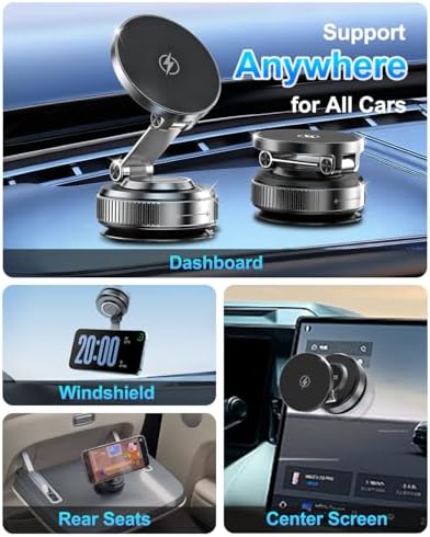 【2026 Upgrade N55 Ultra-Strong Magnetic Hold】 Our magnetic wireless car charger suction cup phone mount features 25 high-performance N55 magnets, delivering 320% stronger magnetic force than standard magnets. Providing a top-tier hold with up to 3000gf of force, It can support the weight of up to 62 phones, and precisely 1:1 aligns with your phone’s built-in magnets, After 10000 vibration tests and extreme road and weather simulations, your phone 100% stable secure and charging normal during bumps, sudden stops, or sharp turns. Secure your phone with magnets for easy GPS navigation, calls, or quick video access.