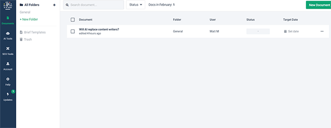 From the side navigation bar, you can access all the AI and SEO tools you need. And you can manage your projects from the Documents page.