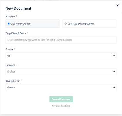 And if you click Advanced Settings, you can choose whether you want Frase to crawl the top 20 results on Google for the target keyword or to crawl a specific domain when providing optimization tips.