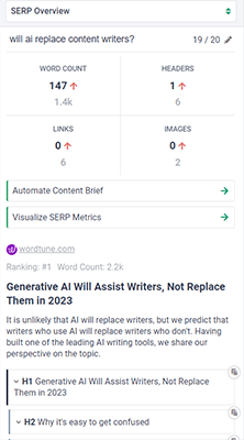 Elsewhere in the Research window, you’ll see a target word count, and a recommended number of images, headers, and links. These recommendations are based on Frase’s SERP analysis. The closer you stick to them, the better chance you should have of ranking for the search query.