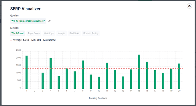 You’ll be able to see a bunch of really useful metrics, like each ranked page’s word count, topic score, domain rating, headings count, etc. as well as their ranking position. This makes it easier to evaluate the competition and plan your content accordingly.