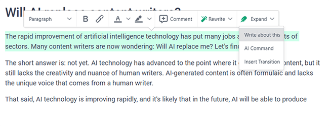 Highlight any text inside the editor, and a toolbar will pop up. On this toolbar, there are some really cool AI options