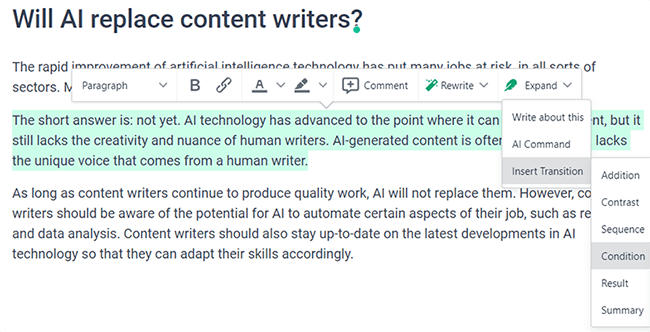 There are other things you can do with the Expand tool too. For example, click Insert Transition, and you can tell Frase to add another paragraph starting with a specific transition word.