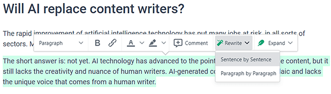 All you have to do is highlight the text, and click Rewrite. Then, choose whether you want to rewrite it sentence by sentence or paragraph by paragraph.