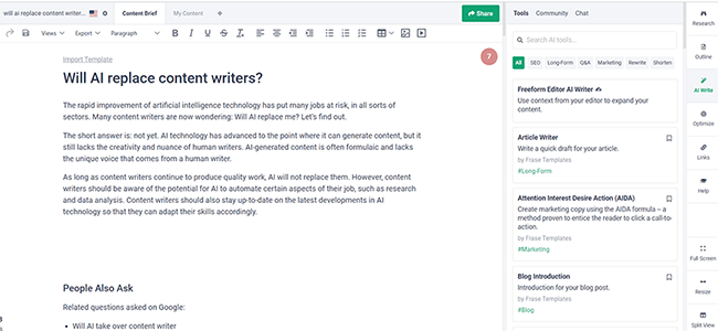 The best way to use Frase is to speed up your workflow and writing process. It can get some words onto the page to give you off the mark, but it’ll probably still need to be edited or rewritten by a real human to get it ready for publication.