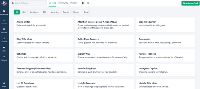 From your Frase dashboard, click SEO Tools to access them.