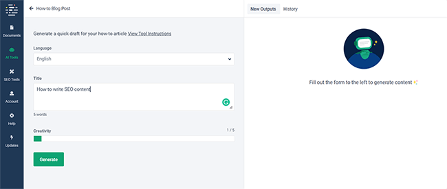 For this test, our title is going to be ‘How to write SEO content’, with a Creativity level of 3 out of 5.