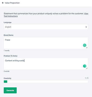 To test Frase’s ability to write short-form content, I selected the Value Proposition template, which writes a statement summarizing how a product can uniquely solve a customer problem.