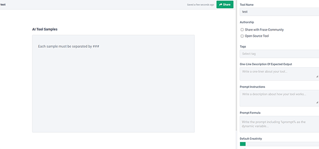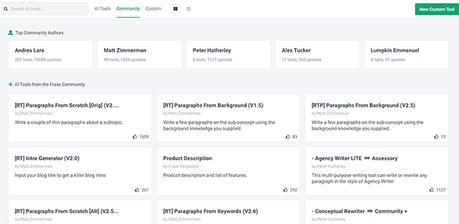 - Very flexible. What makes Frase better than most other AI writers is how flexible it is. Thanks to the community feature, there is a near-limitless number of templates to choose from covering every use case imaginable. And you can even program your own templates with the Custom Tool feature.