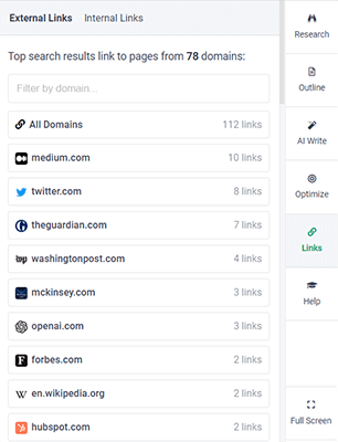 Another way Frase can help you to optimize your content for SEO is through internal and external link suggestions.
