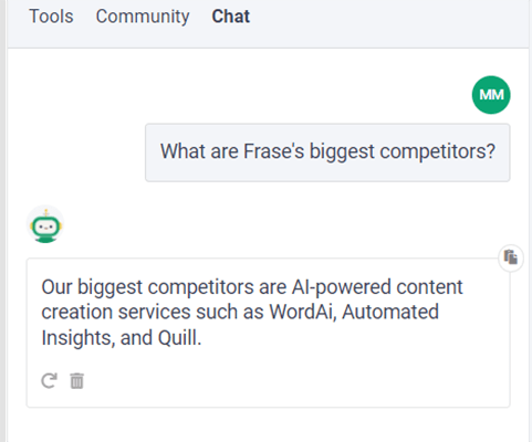For example, I asked it “What are Frase’s biggest competitors?” and it came back with this: