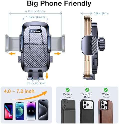 🎁【𝐁𝐢𝐠 𝐏𝐡𝐨𝐧𝐞 & 𝐓𝐡𝐢𝐜𝐤 𝐂𝐚𝐬𝐞 𝐅𝐫𝐢𝐞𝐧𝐝𝐥𝐲】: Deeper and wider adjustable clamping arms and adjustable feet are designed to allow our car phone mount to accommodate larger and thicker phones and cases. Fits all 4-7 inch phones such as iPhone 17,16,15, 14, 13, 12 Series; Galaxy S24/S23/S22/S21 and more. In addition to Otter box case, Wallet case, Thick case, etc. are all compatible.